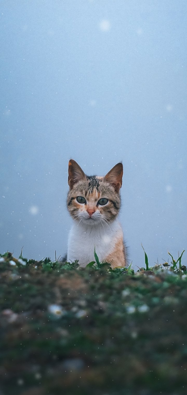 Wallpaper: cat, snow, grass - 720x1520