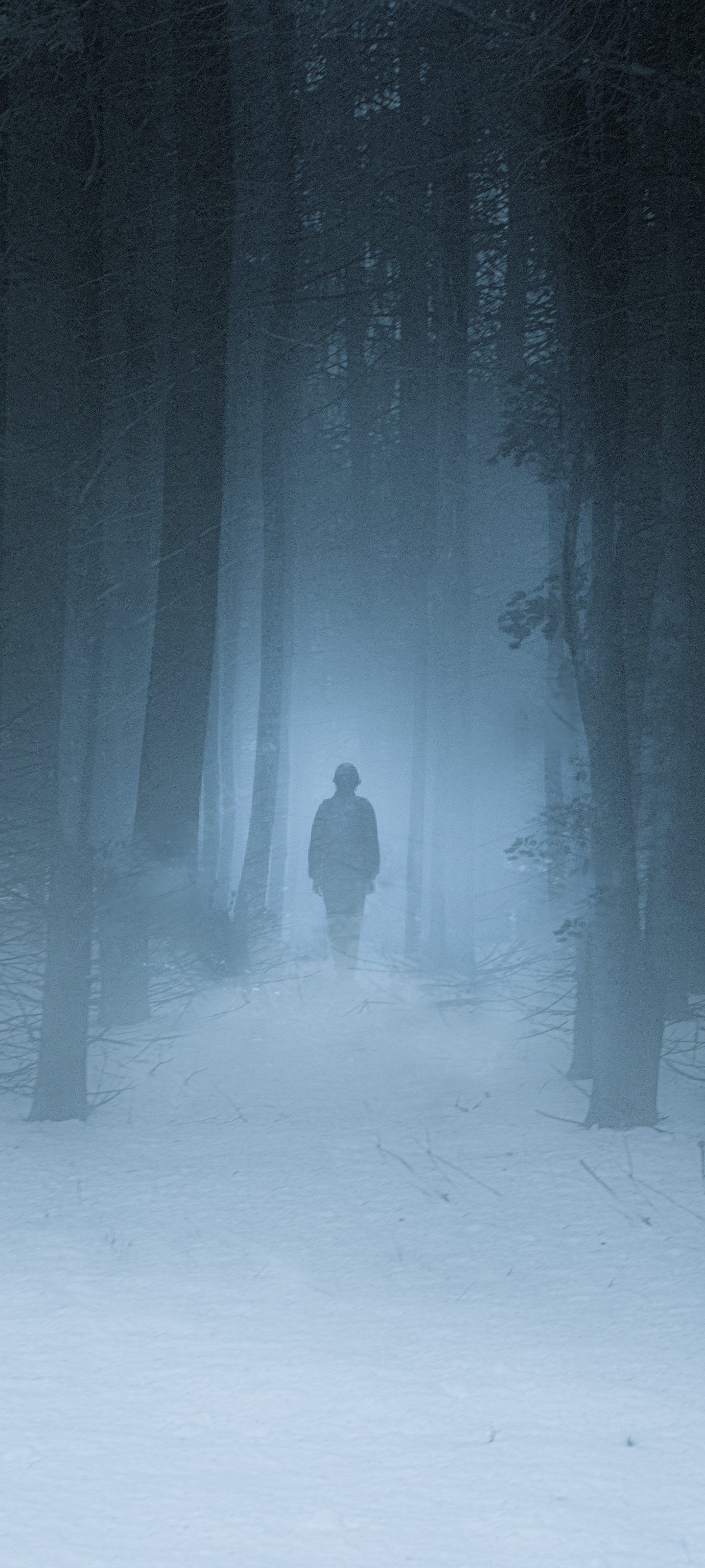 Wallpaper: foggy forest, man, snow - 1440x3200