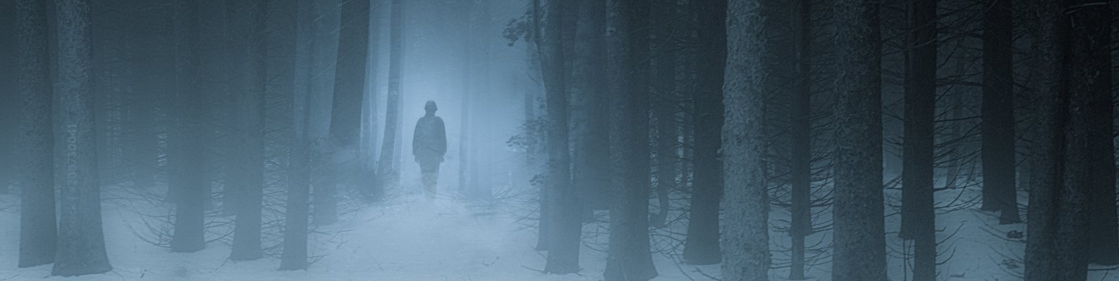 Wallpaper: foggy forest, man, snow - 1590x400