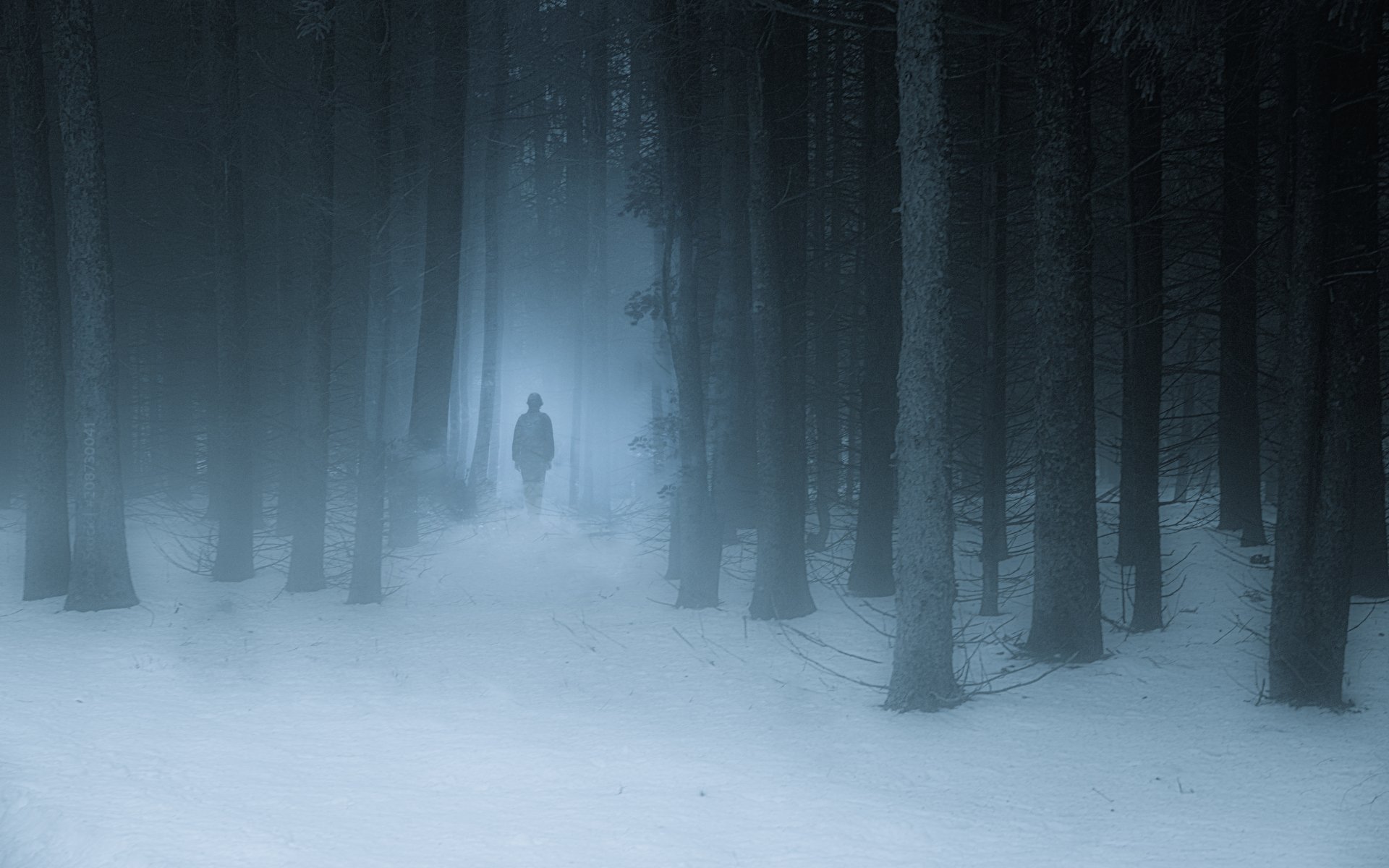 Wallpaper: foggy forest, man, snow - 1920x1200