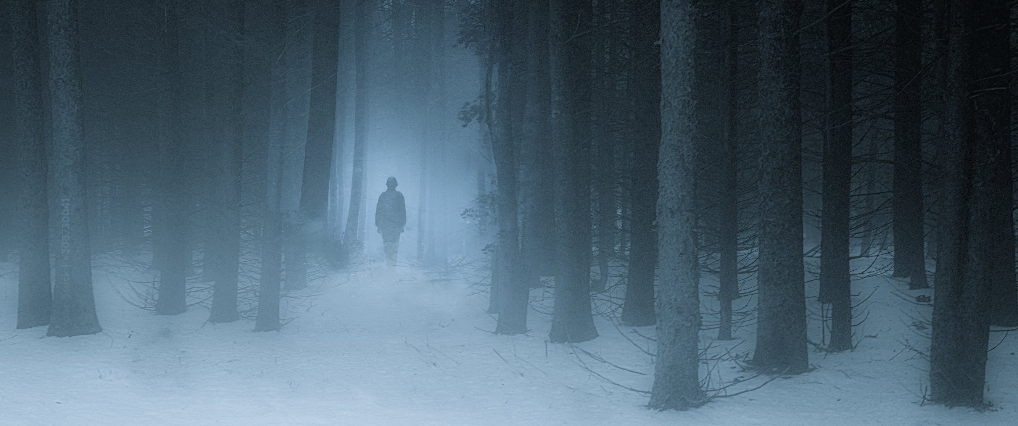 Wallpaper: foggy forest, man, snow - 3440x1440