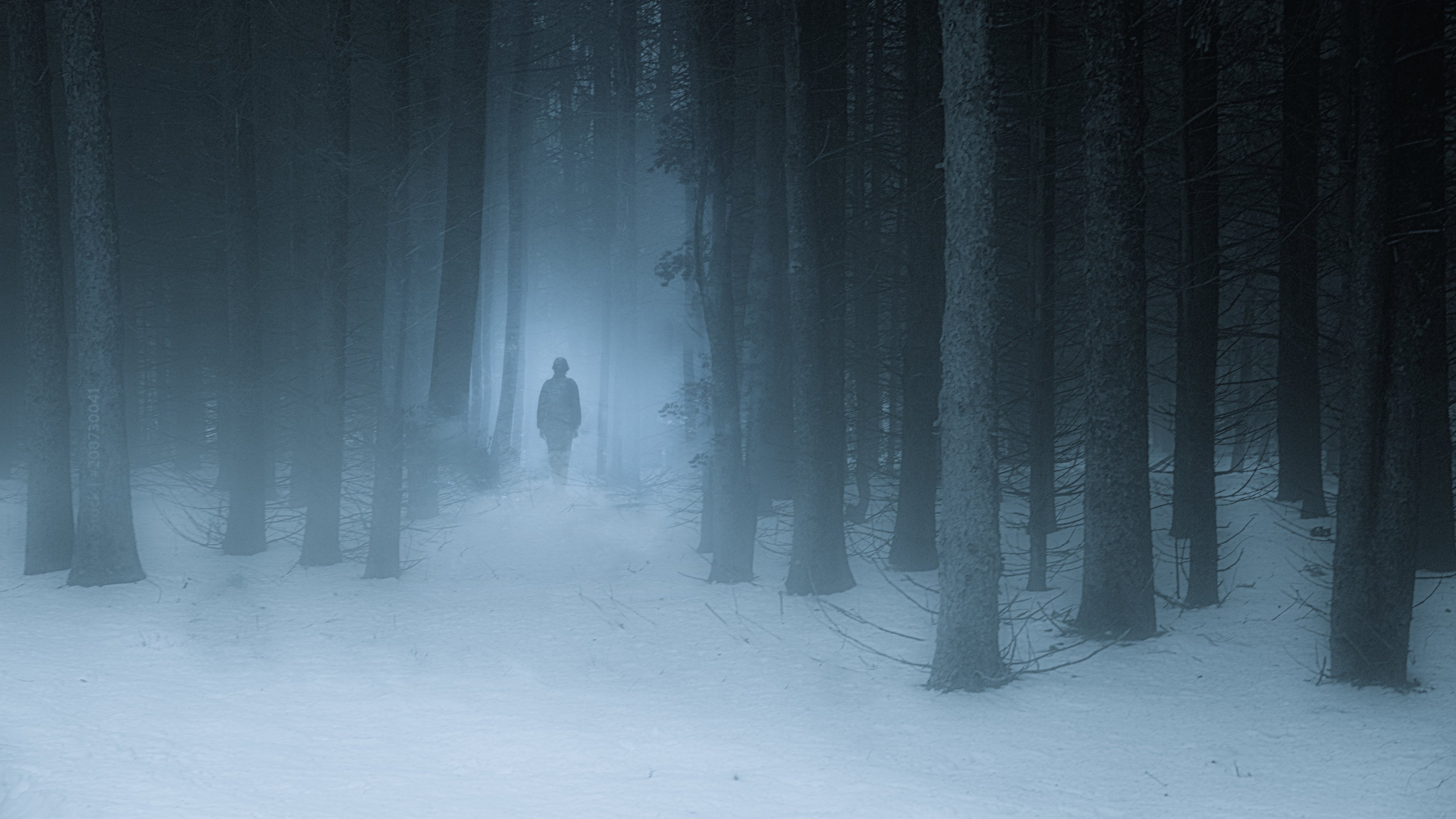 Wallpaper: foggy forest, man, snow - 3840x2160