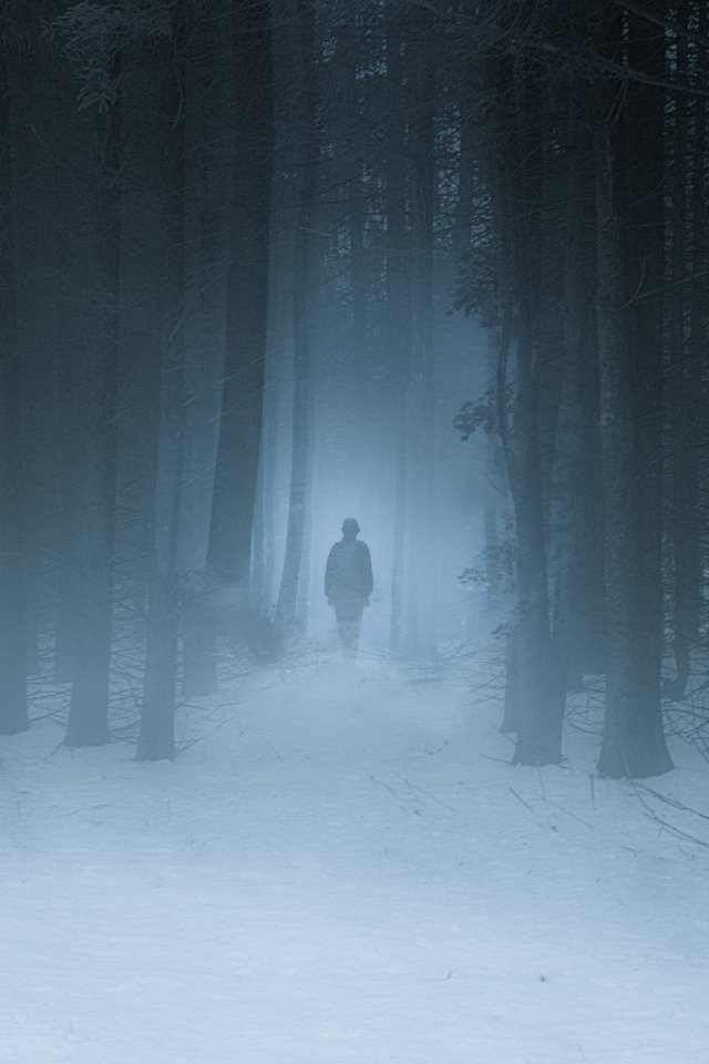 Wallpaper: foggy forest, man, snow - 640x960