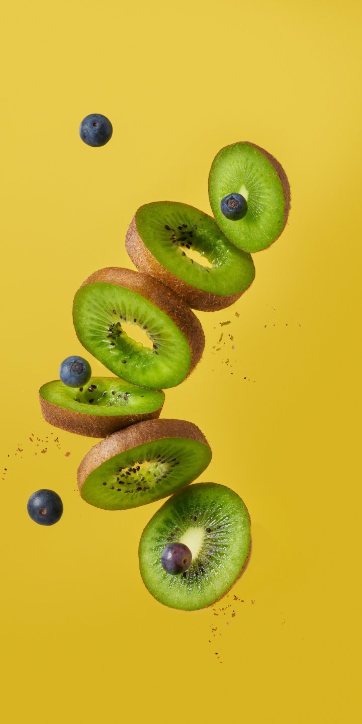 Wallpaper: kiwi, blueberry, yellow background - 720x1440