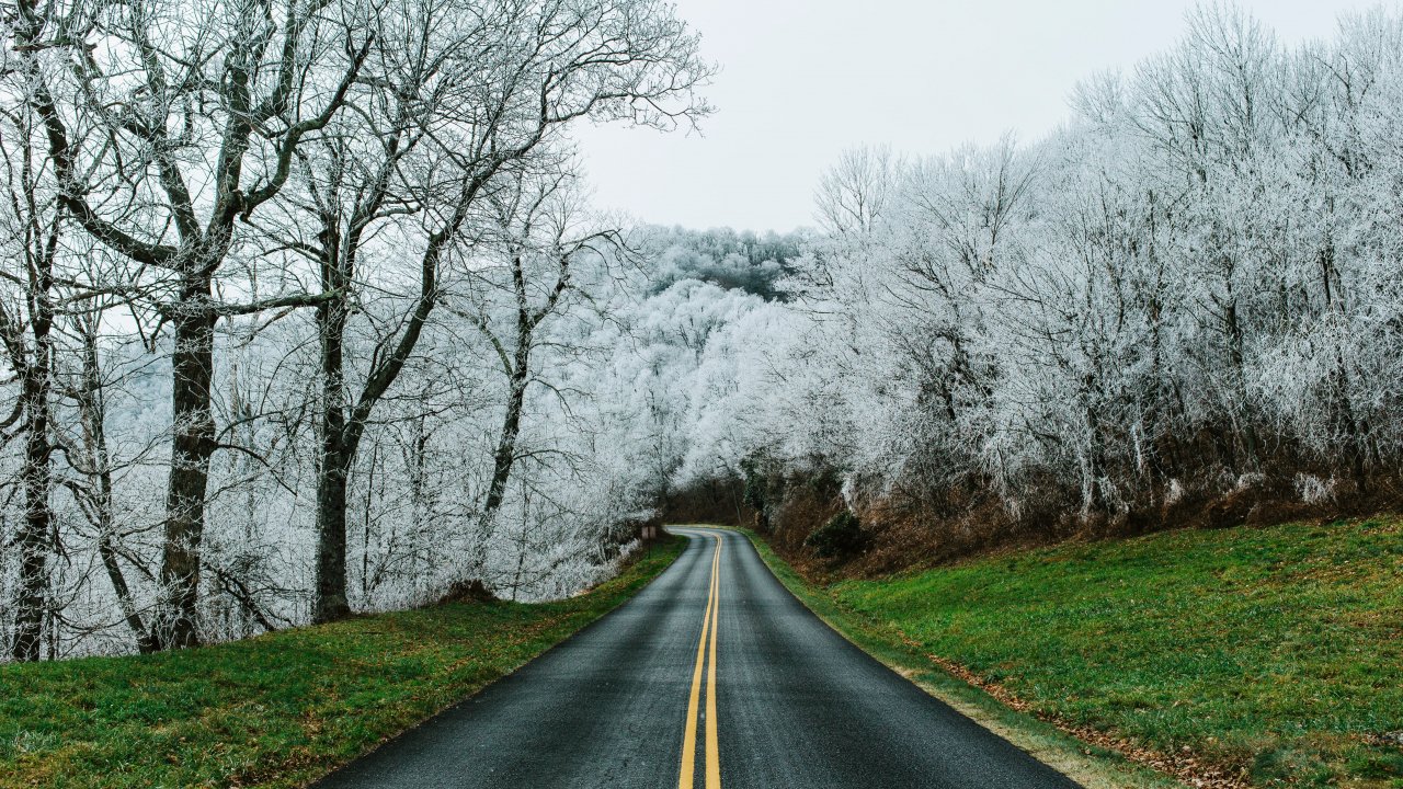 Wallpaper: road, snow forest - 1280x720