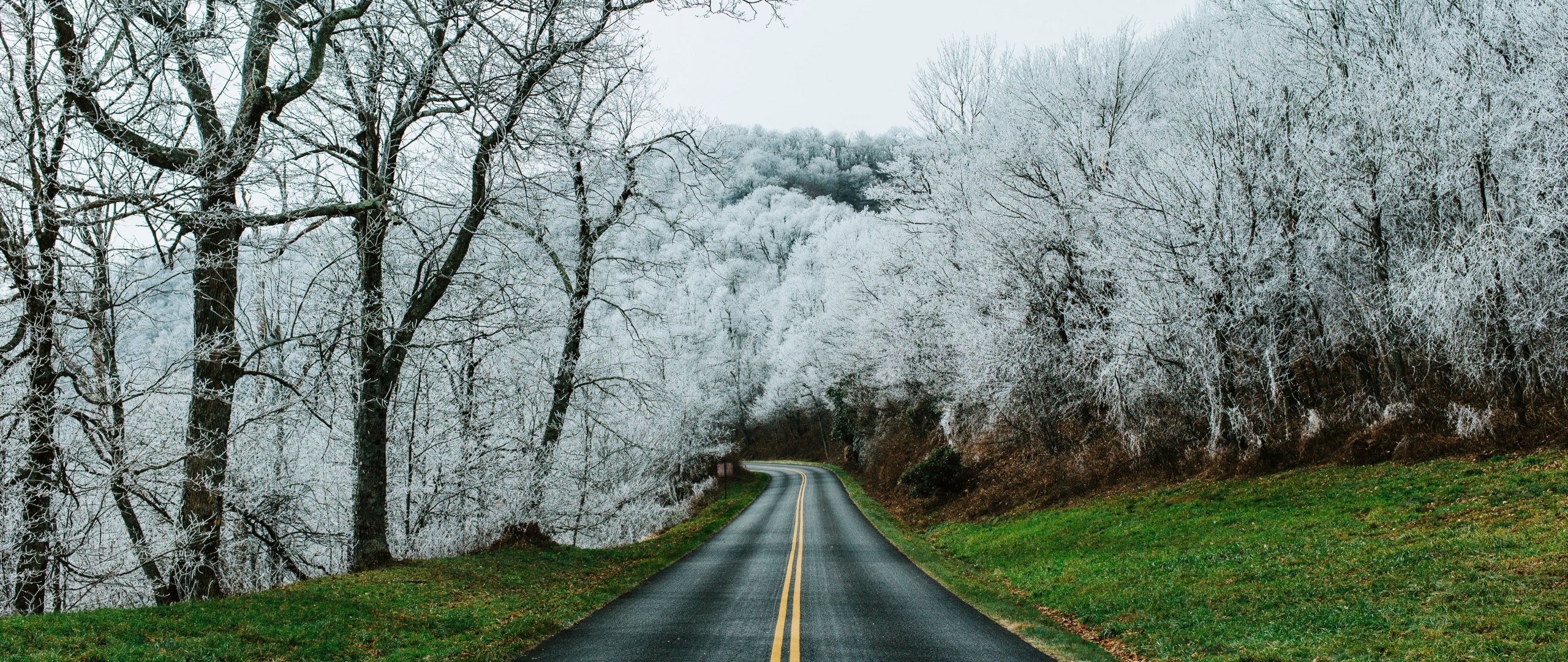 Wallpaper: road, snow forest - 2560x1080