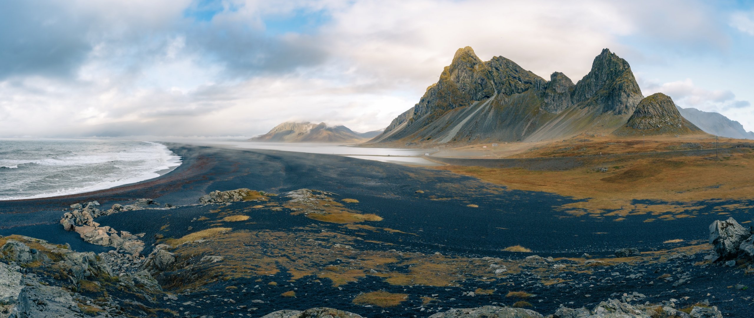 Wallpaper: beach, sea, black sand - 2560x1080