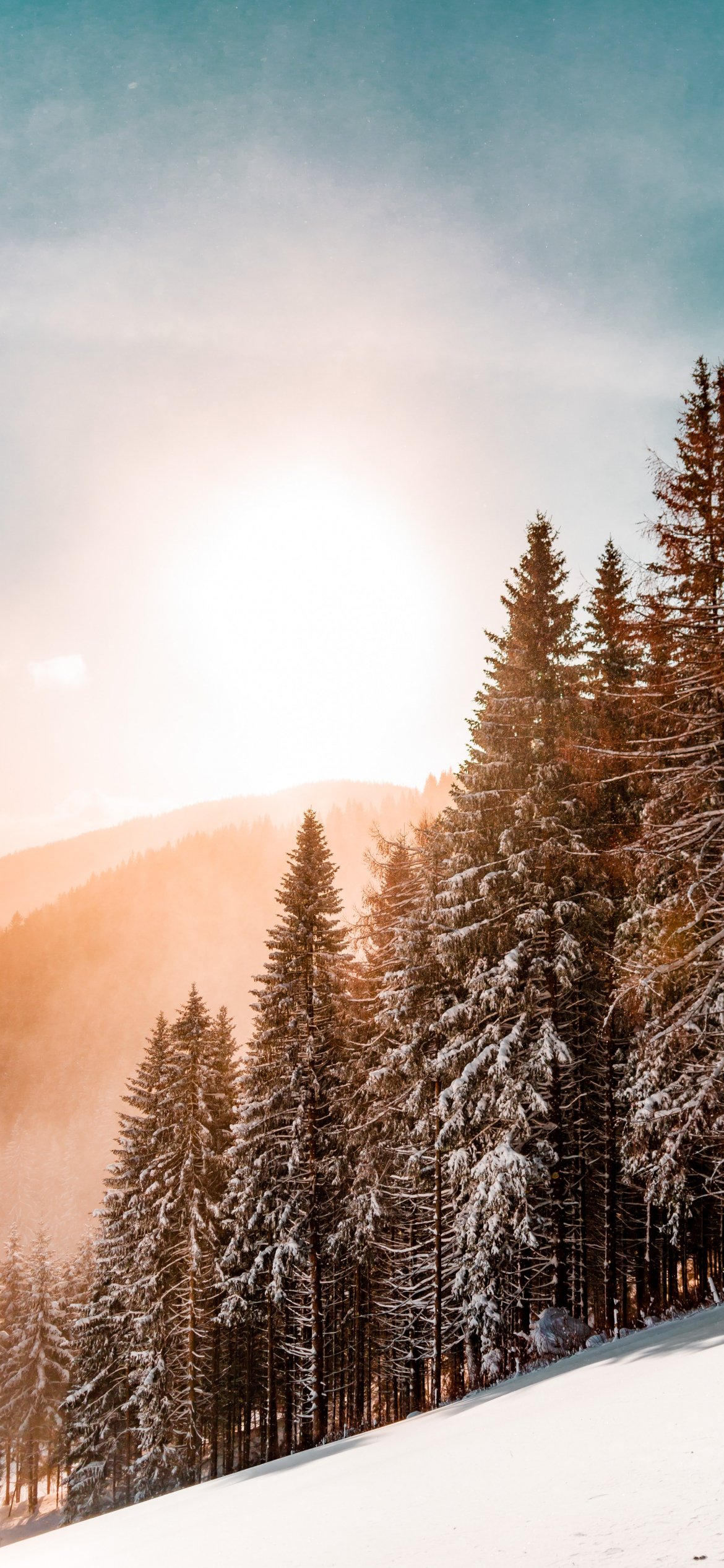 Wallpaper: snow forest, dawn, winter - 1170x2532