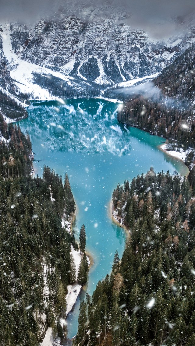 Wallpaper: mountains, forest, snowfall - 640x1136