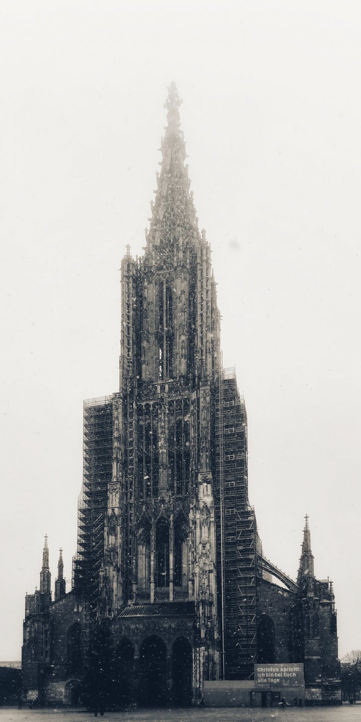 Wallpaper: building, gray, snowfall - 720x1440