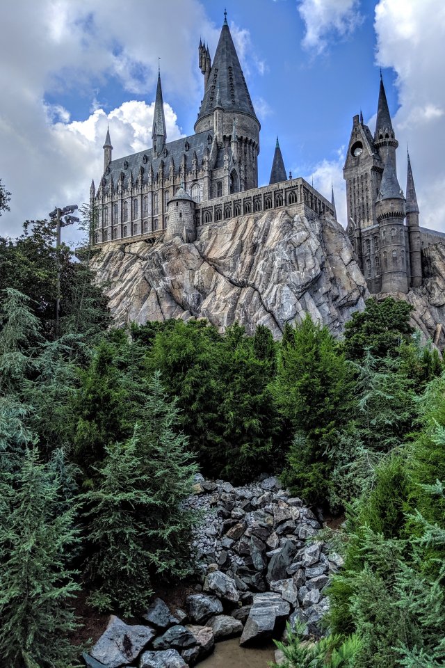 Wallpaper: Hogwarts, lock, coniferous trees - 640x960