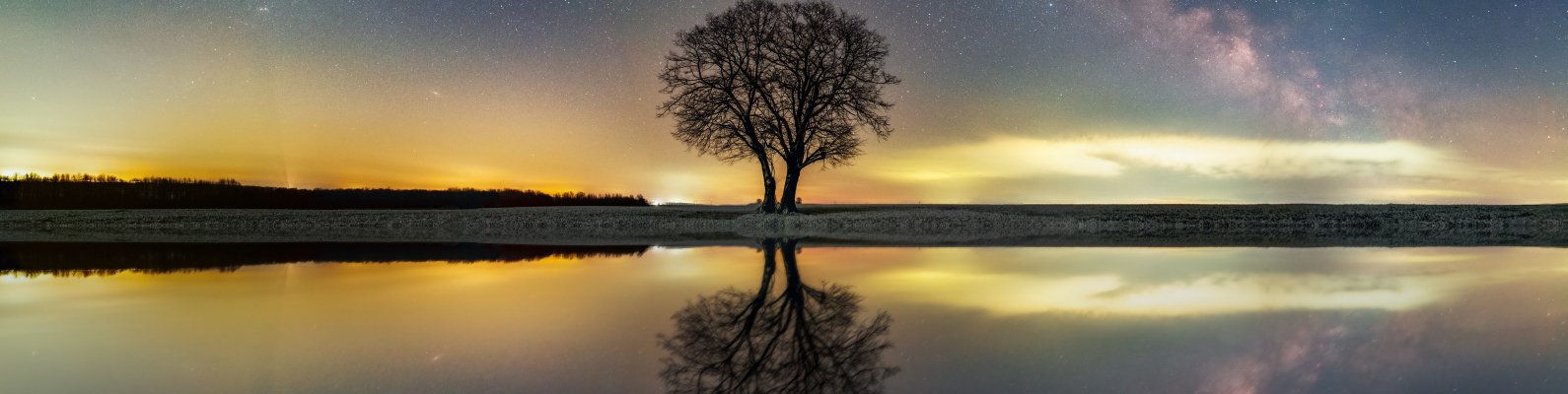 Wallpaper: milky way, tree, lake - 1590x400