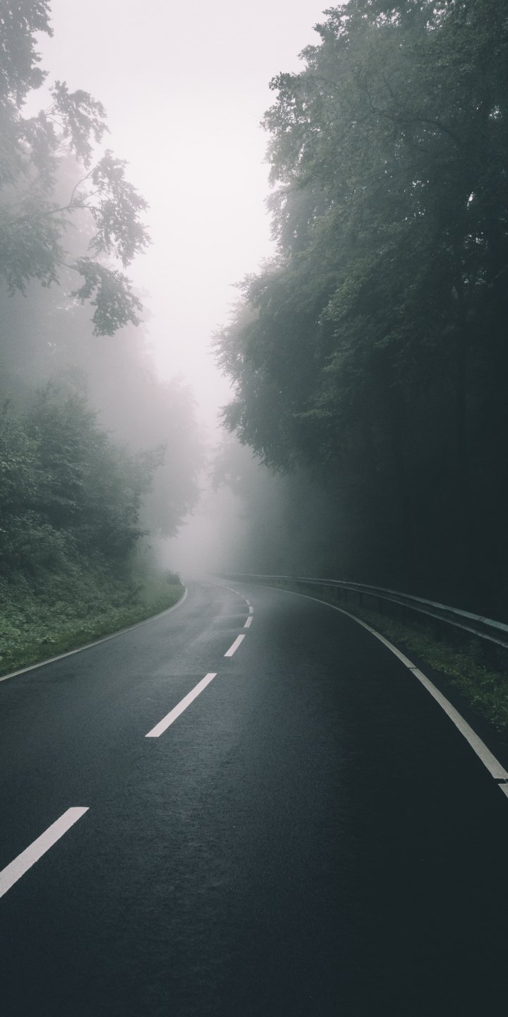 Wallpaper: road, forest, fog - 720x1440