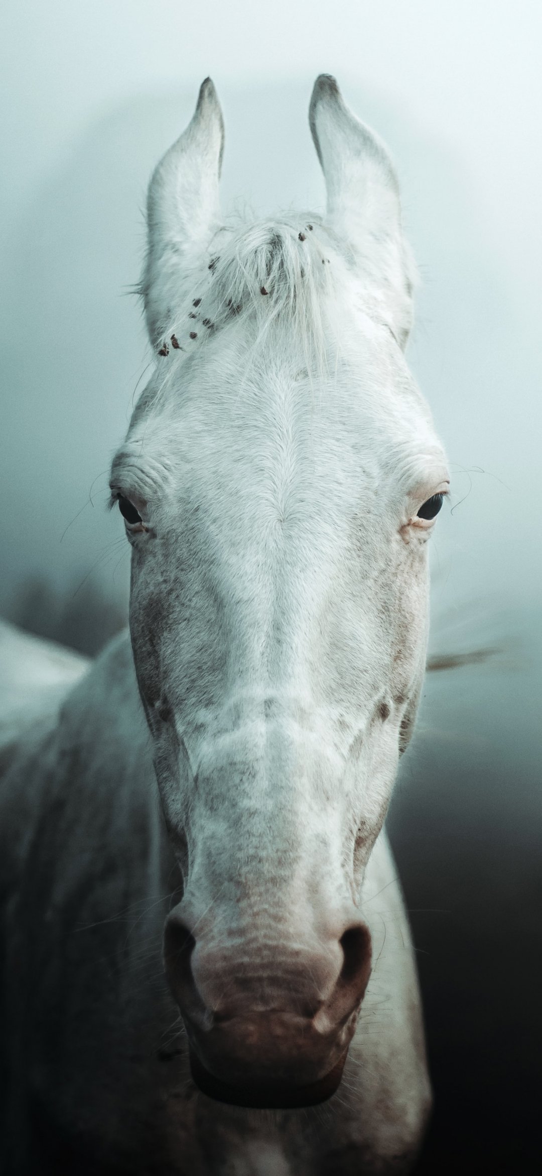 Wallpaper: white horse, fog - 1080x2340