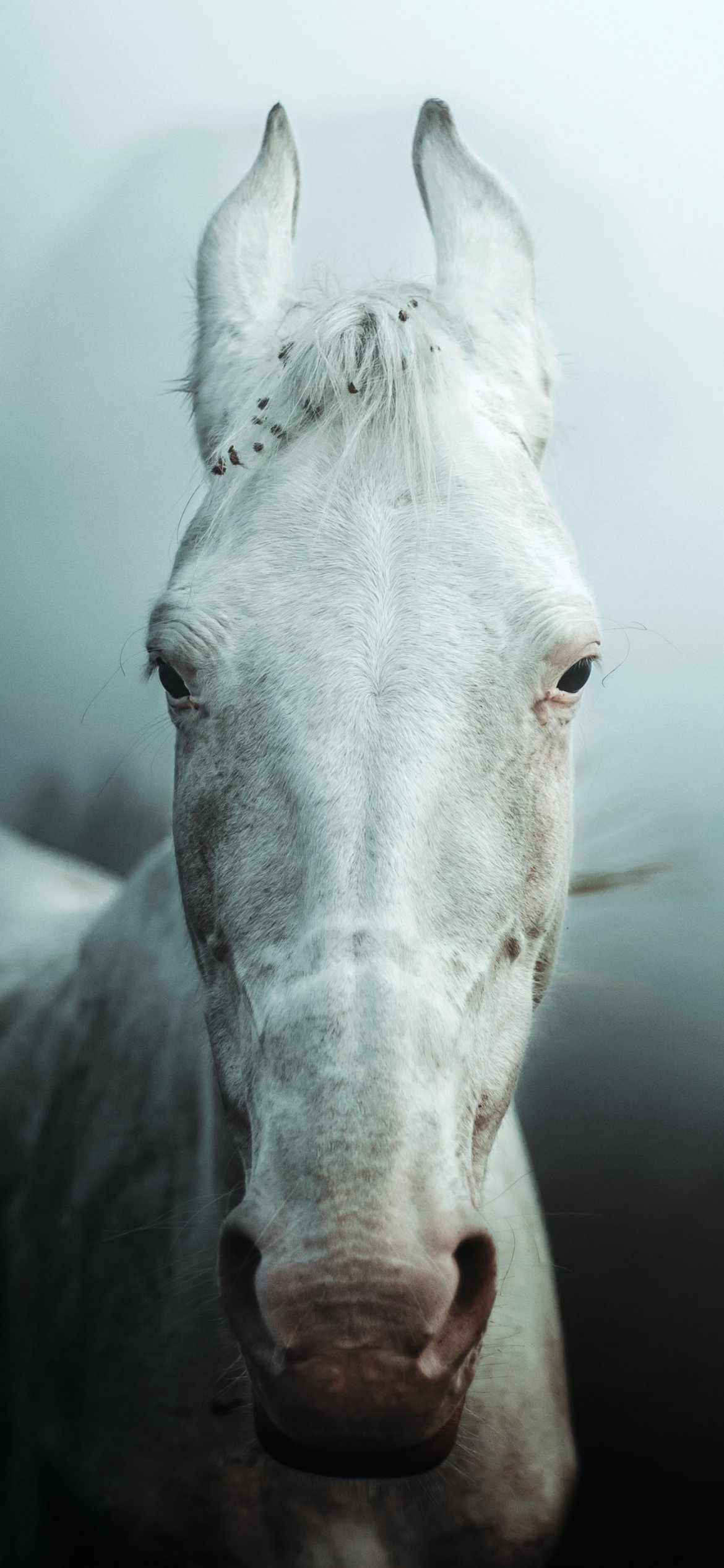 Wallpaper: white horse, fog - 1170x2532