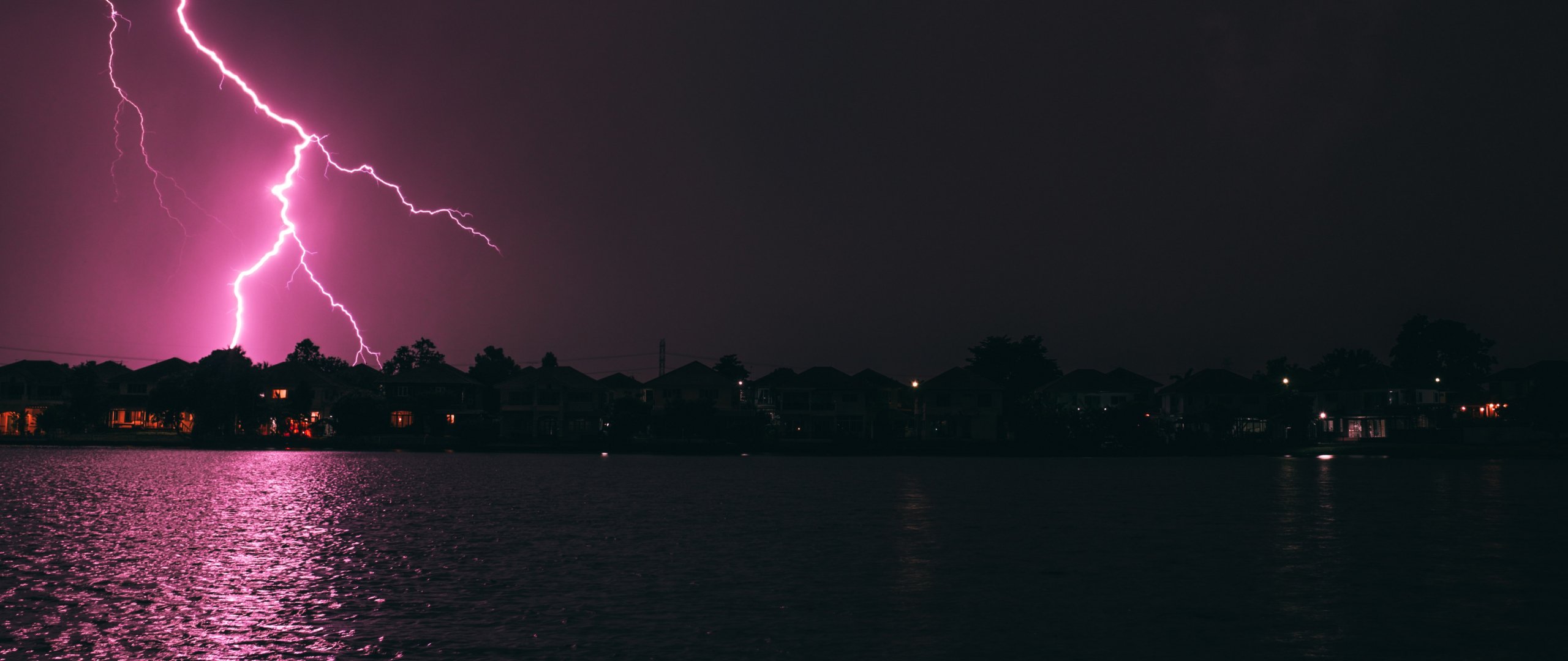 Wallpaper: lightning, night, coast - 2560x1080