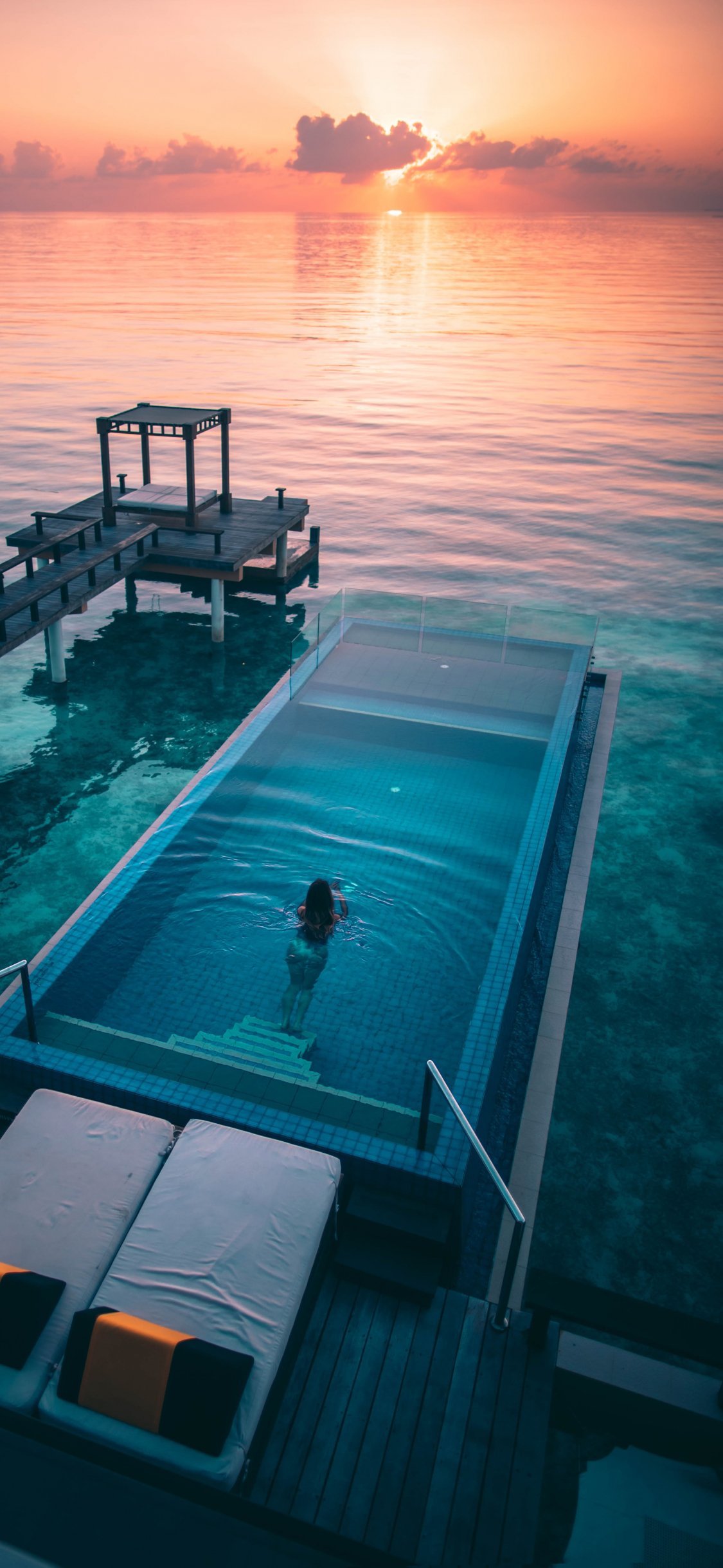 Wallpaper: Maldives, sunset, swimming pool - 1125x2436