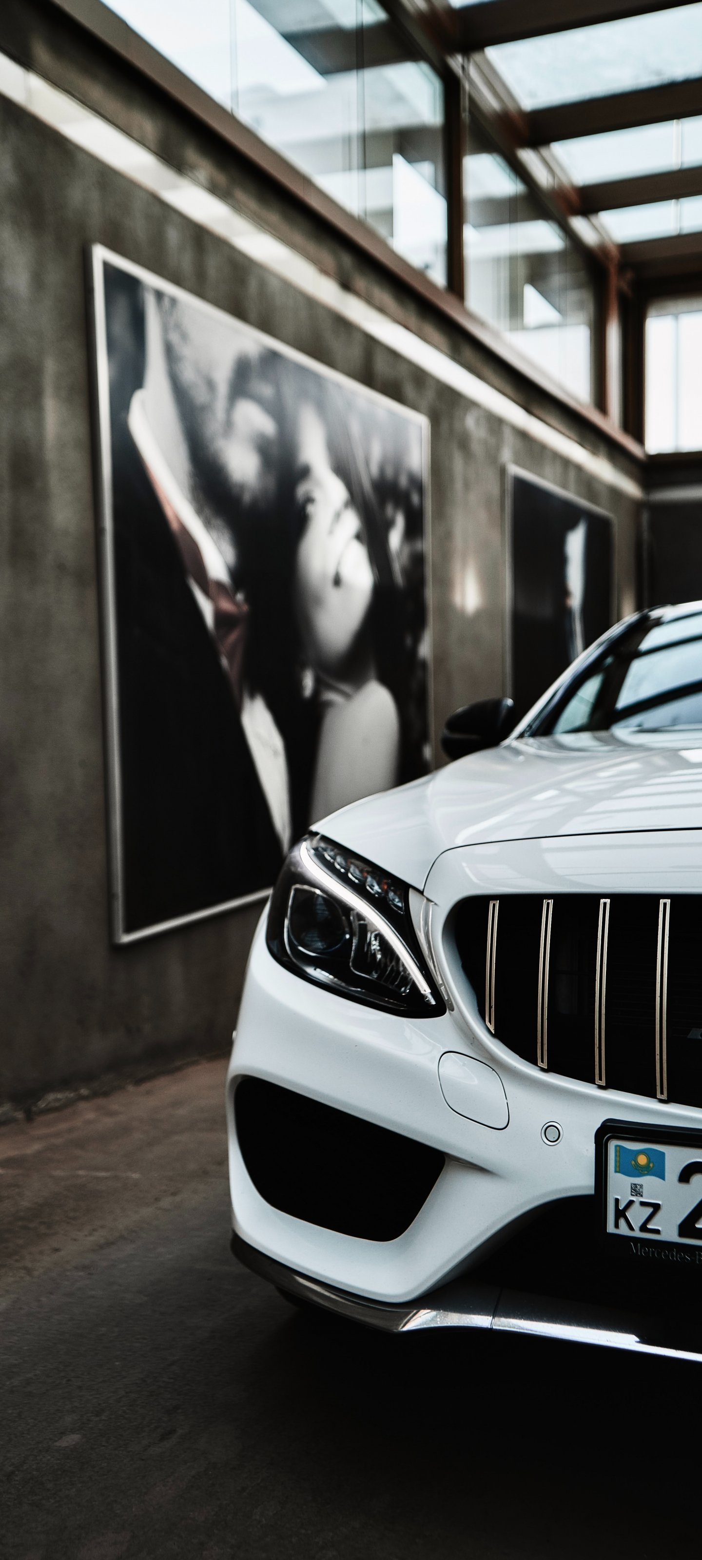 Wallpaper: white mercedes, garage - 1440x3200