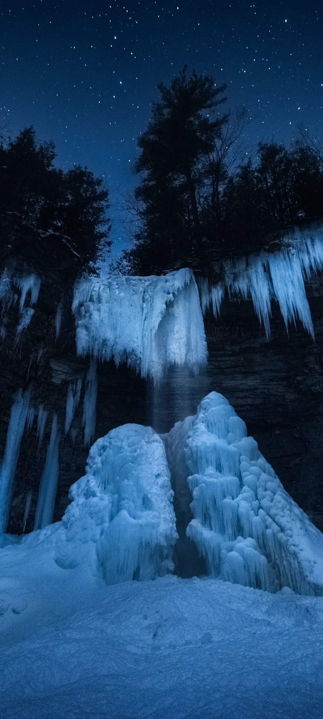 Wallpaper: frozen waterfall, night forest, winter - 1080x2400