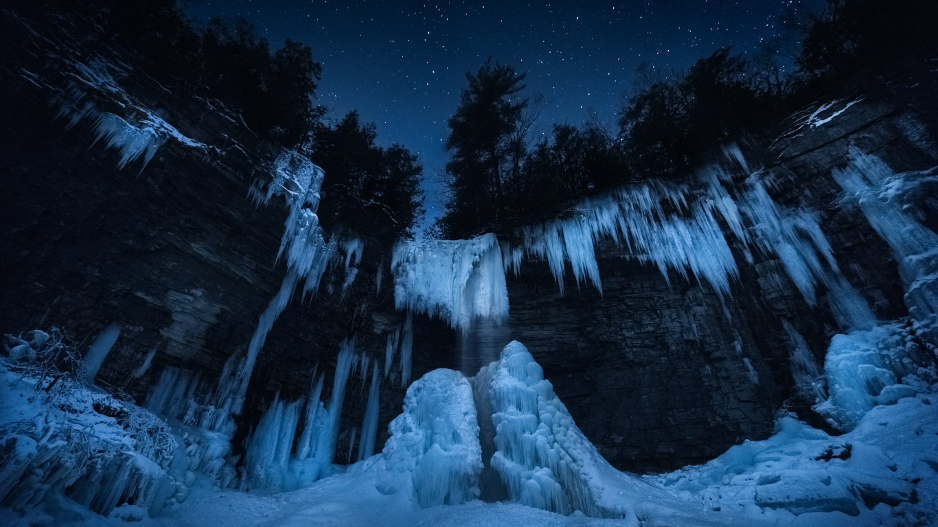 Wallpaper: frozen waterfall, night forest, winter - 1366x768