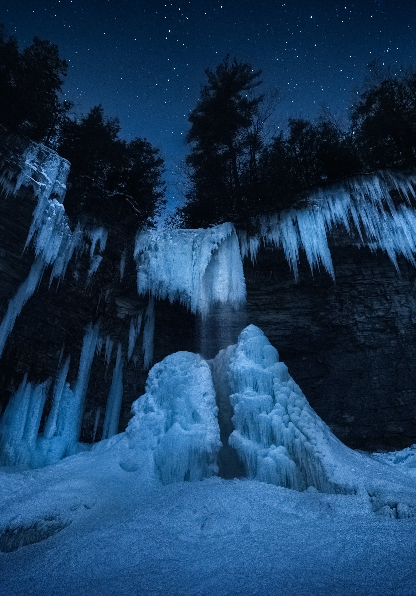 Wallpaper: frozen waterfall, night forest, winter - 1668x2388