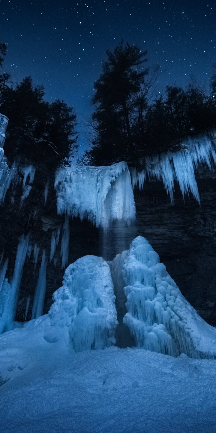 Wallpaper: frozen waterfall, night forest, winter - 720x1440