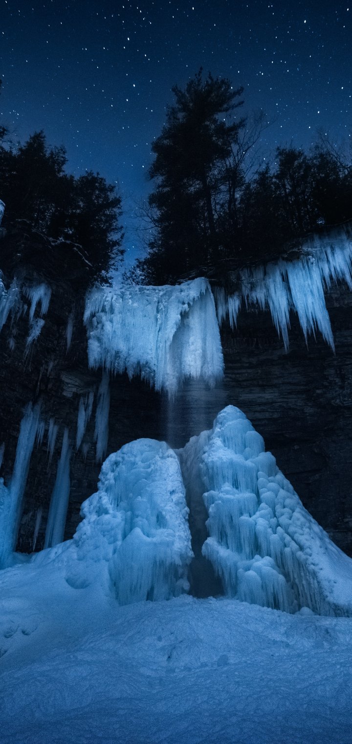 Wallpaper: frozen waterfall, night forest, winter - 720x1520