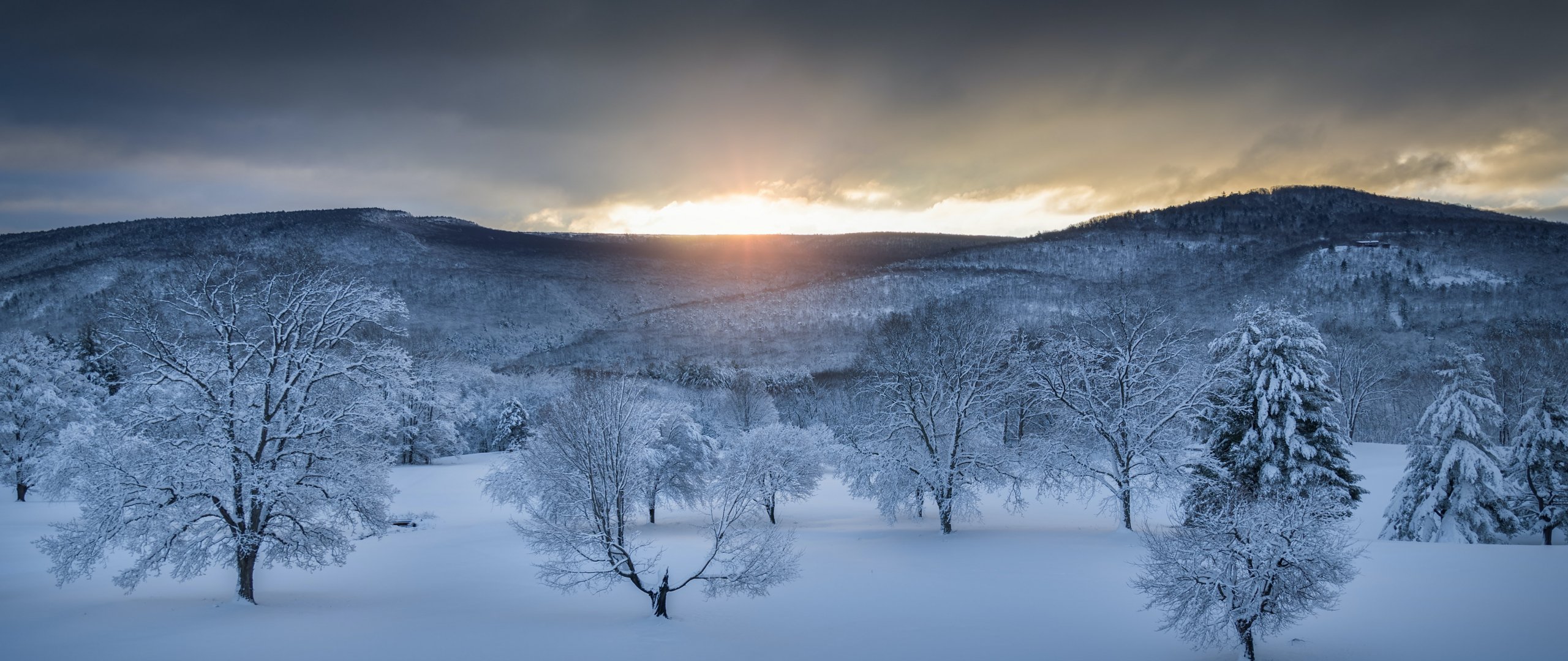 Wallpaper: winter forest, sunset, winter - 2560x1080