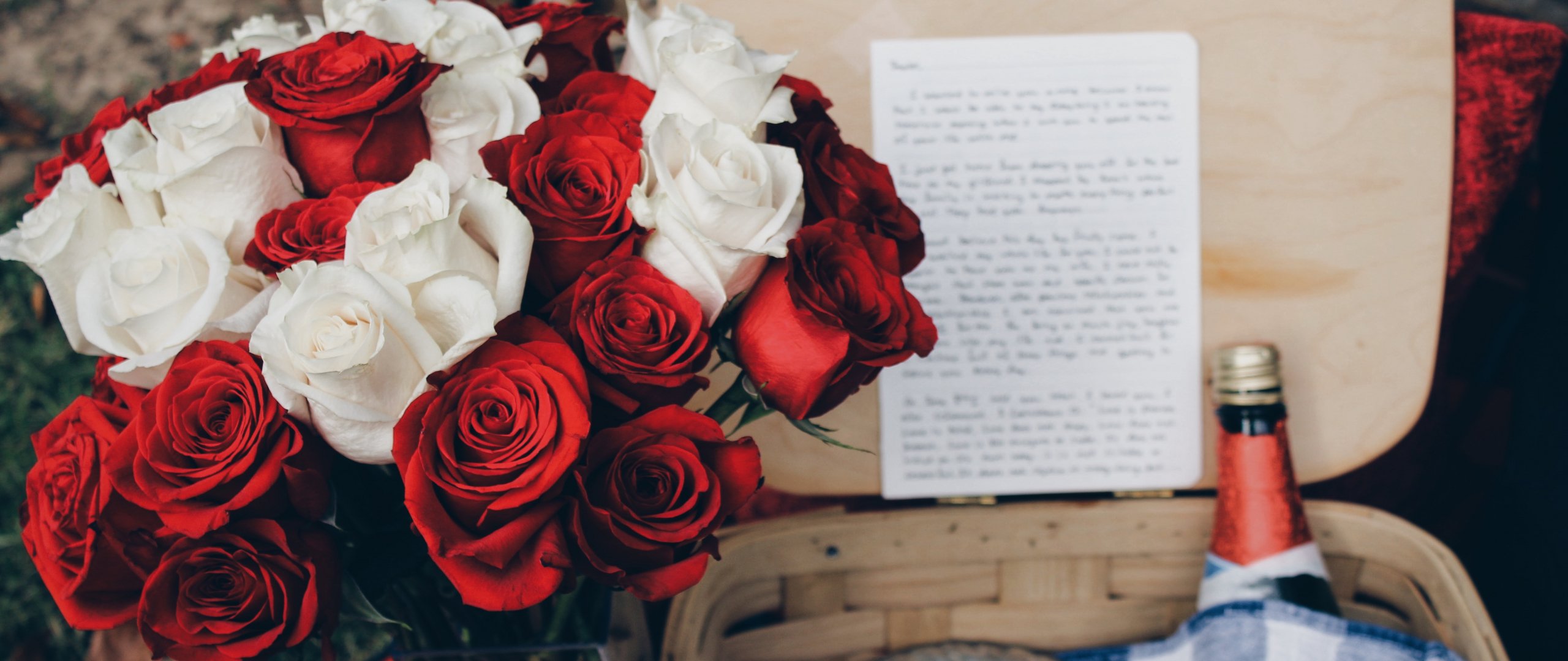 Wallpaper: bouquet of roses, romance, picnic - 2560x1080