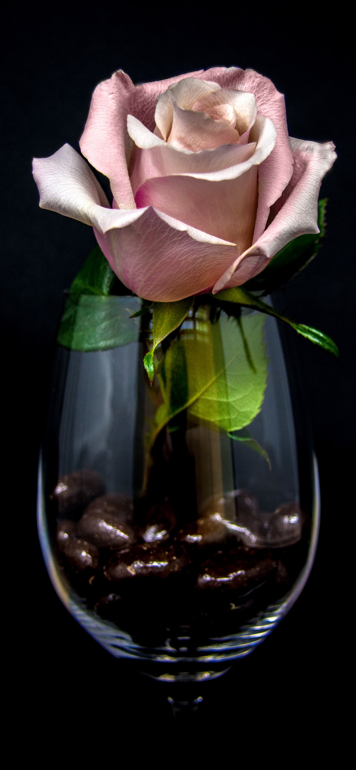 Wallpaper: pink rose in a glass, on black background - 1170x2532