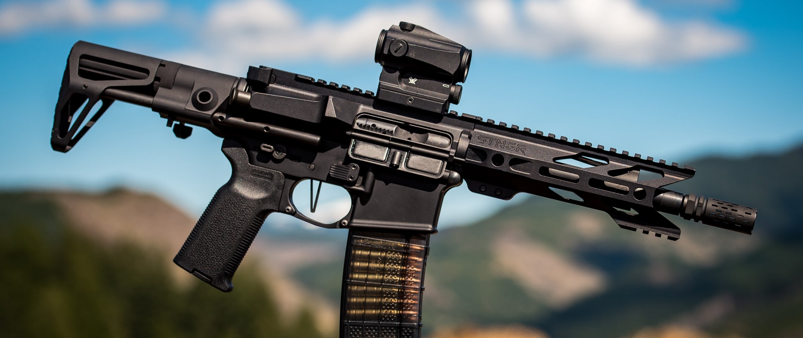 Wallpaper: AR-15 STNGR, machine, weapon - 2560x1080
