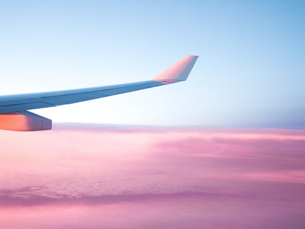 Wallpaper: airplane wing, pink sky, flight - 1024x768