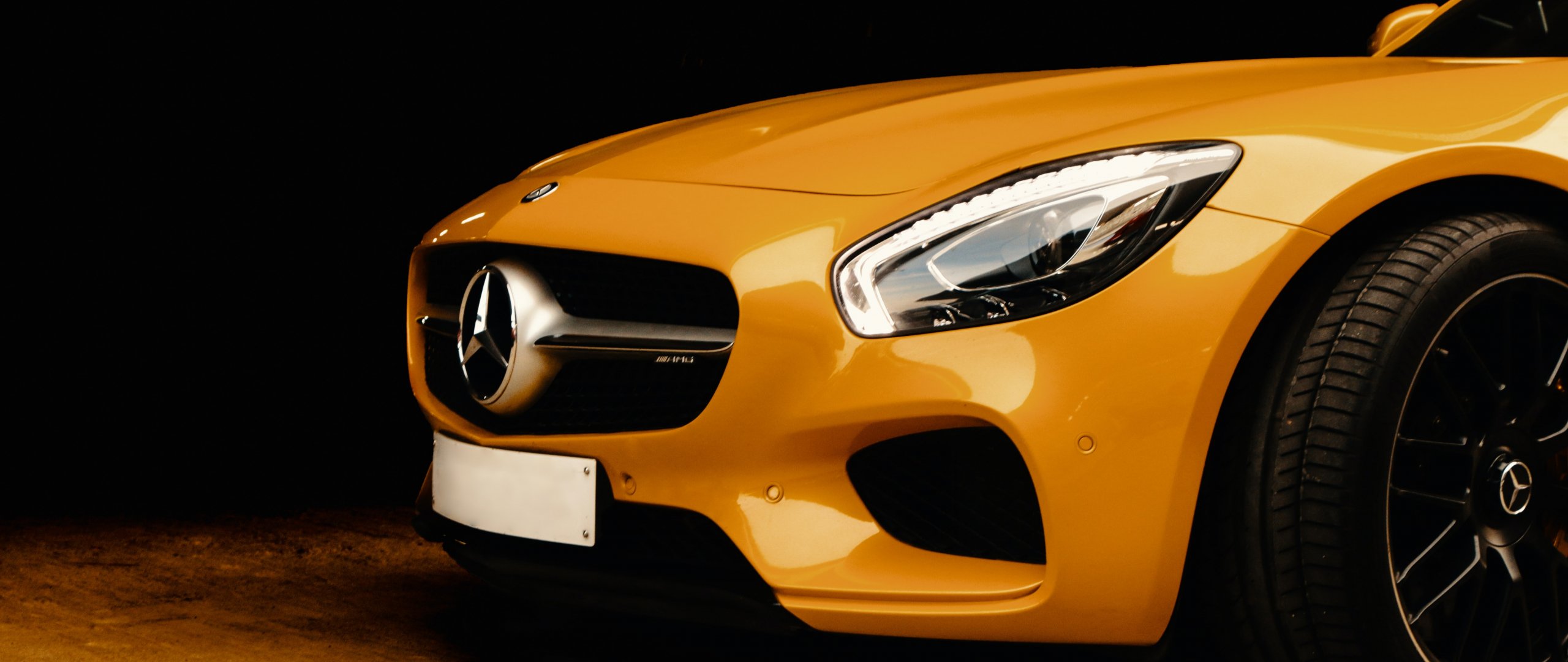 Wallpaper: yellow mercedes, sports car - 2560x1080