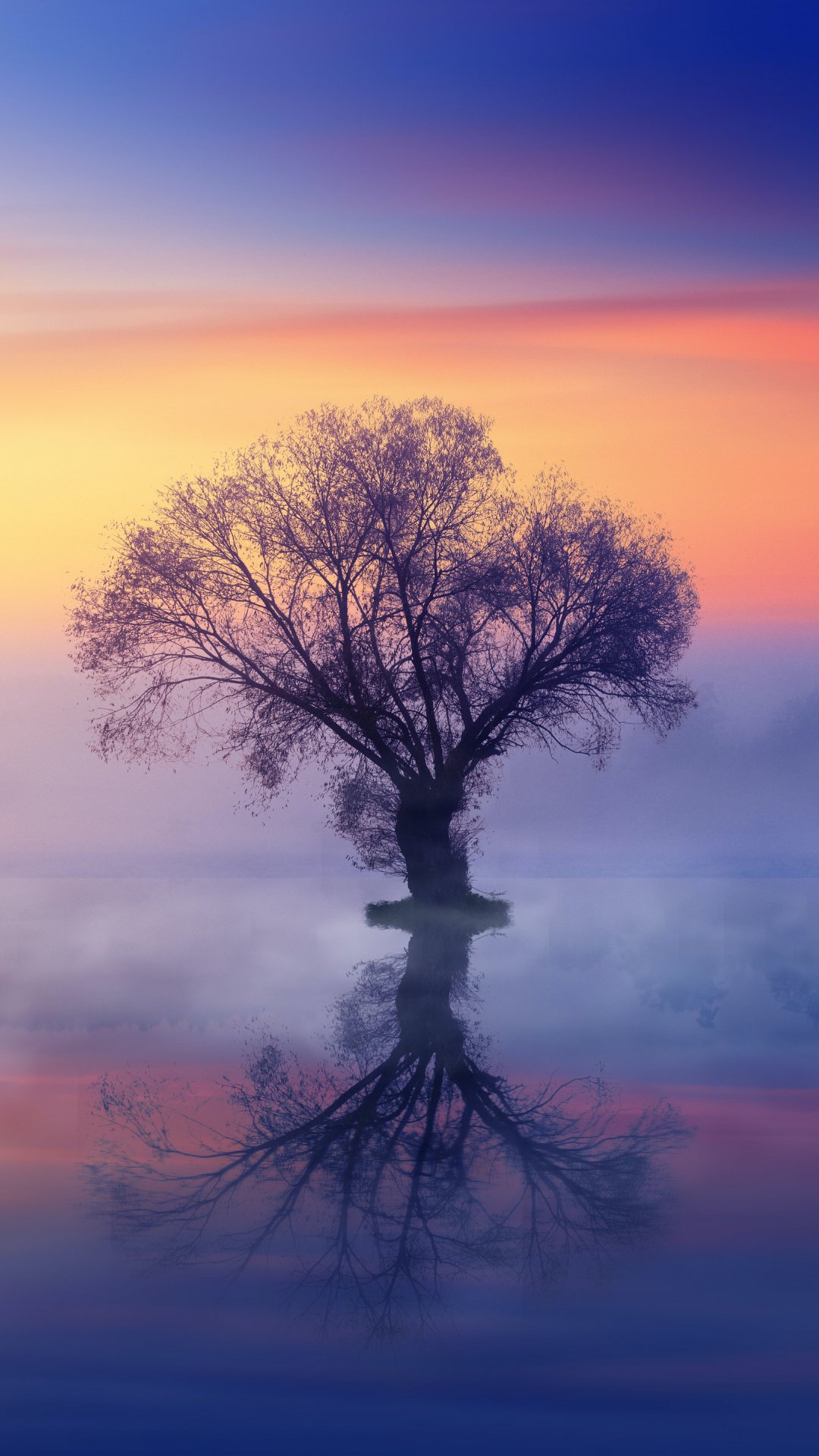 Wallpaper: lonely tree, fog, reflection in the water - 1080x1920