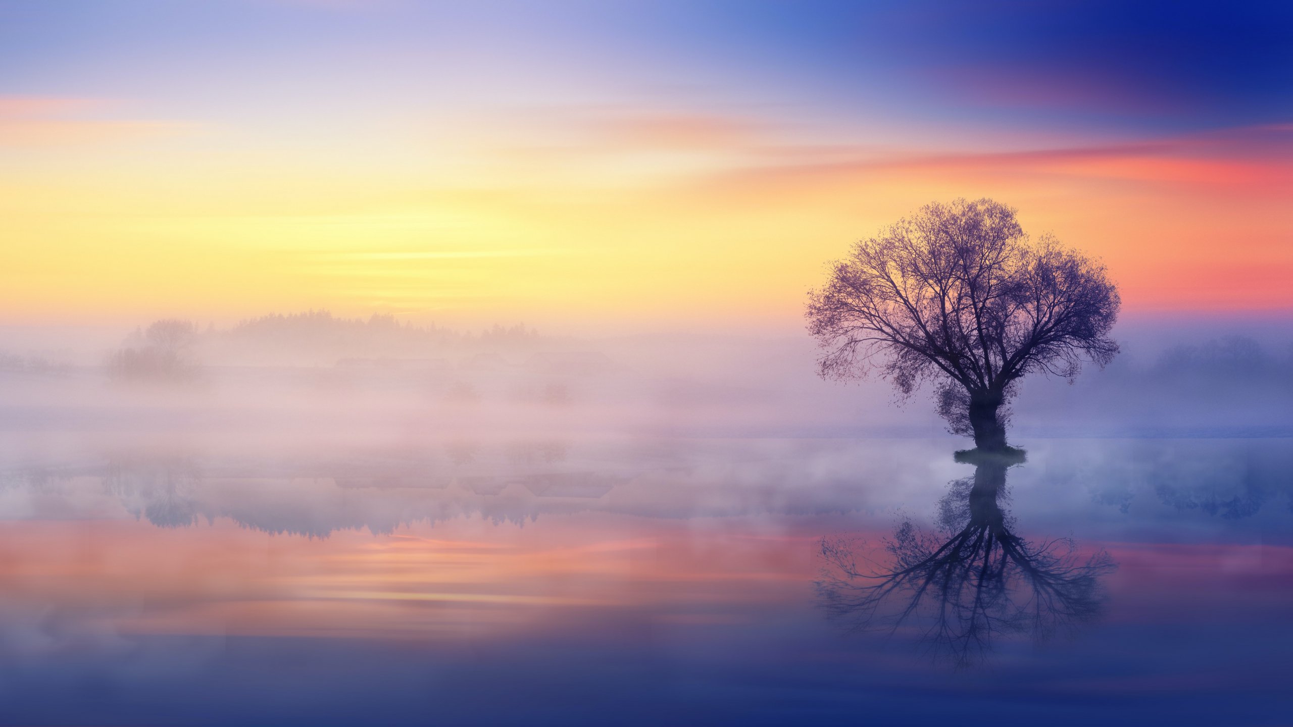 Wallpaper: lonely tree, fog, reflection in the water - 2560x1440