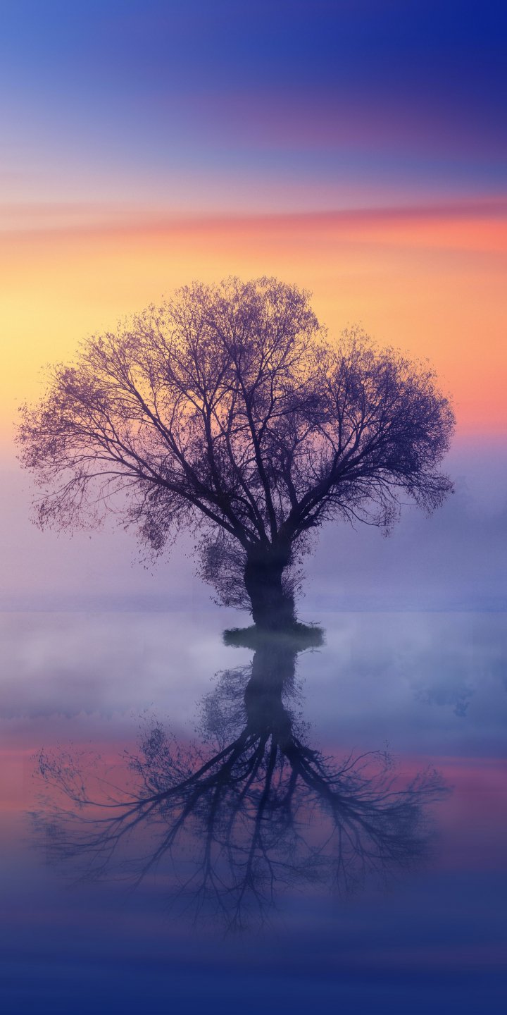 Wallpaper: lonely tree, fog, reflection in the water - 720x1440