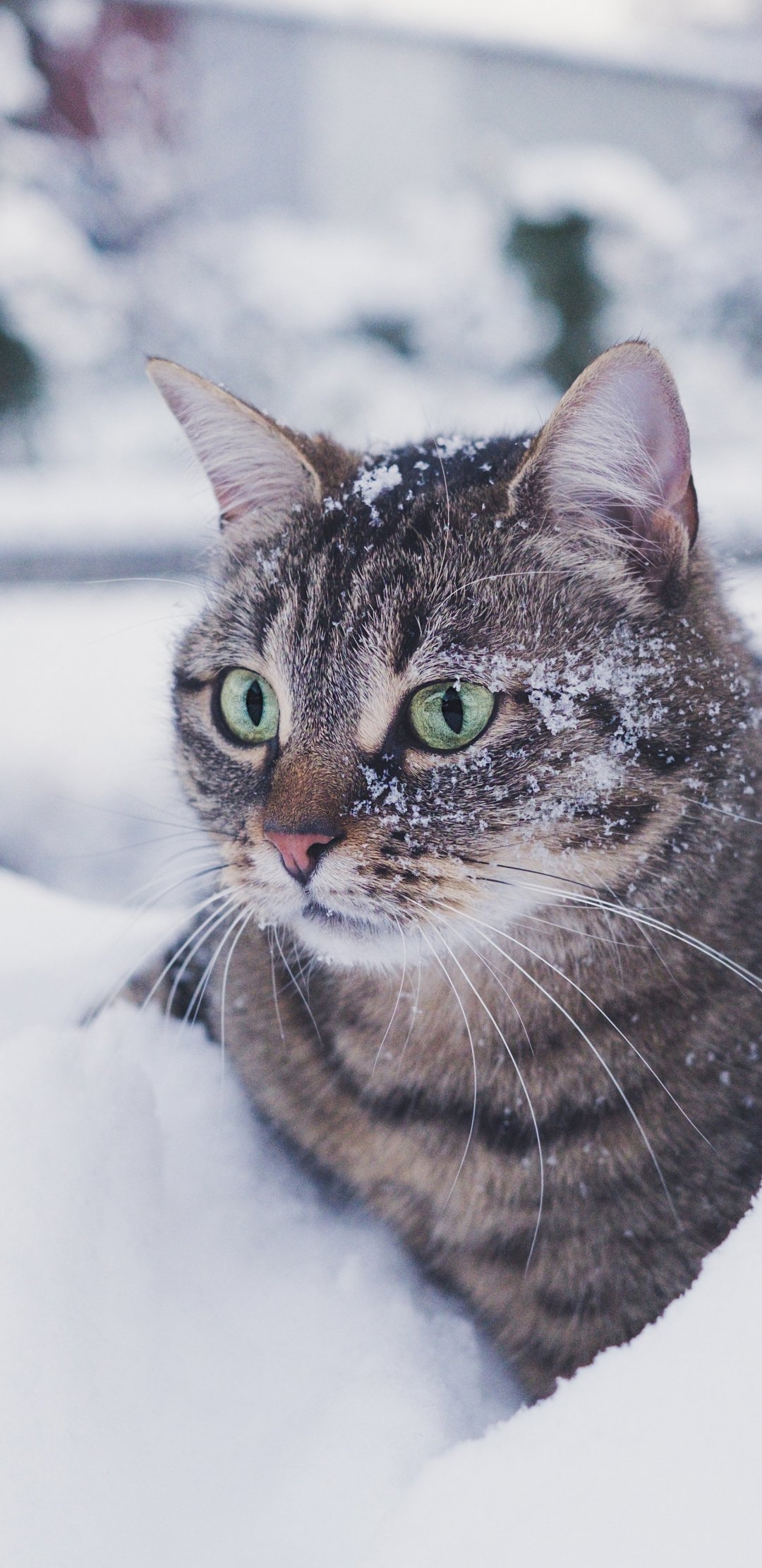 Wallpaper: tabby cat, snow, green eyes - 1080x2220