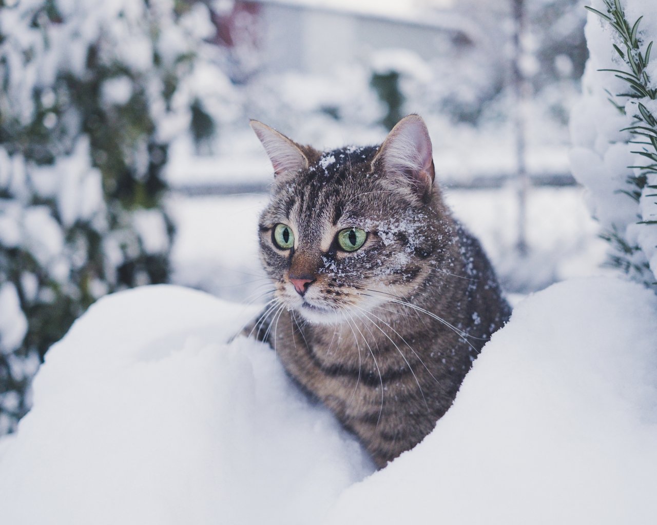 Wallpaper: tabby cat, snow, green eyes - 1280x1024