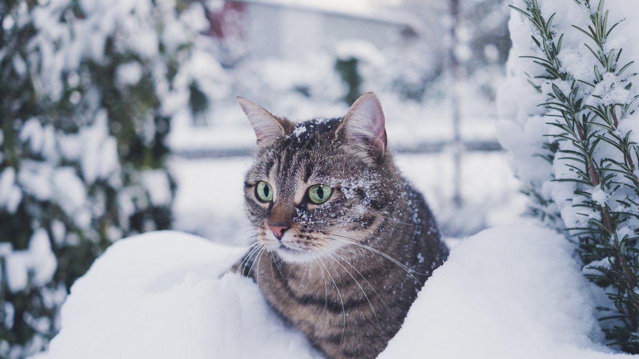 Wallpaper: tabby cat, snow, green eyes - 1280x720