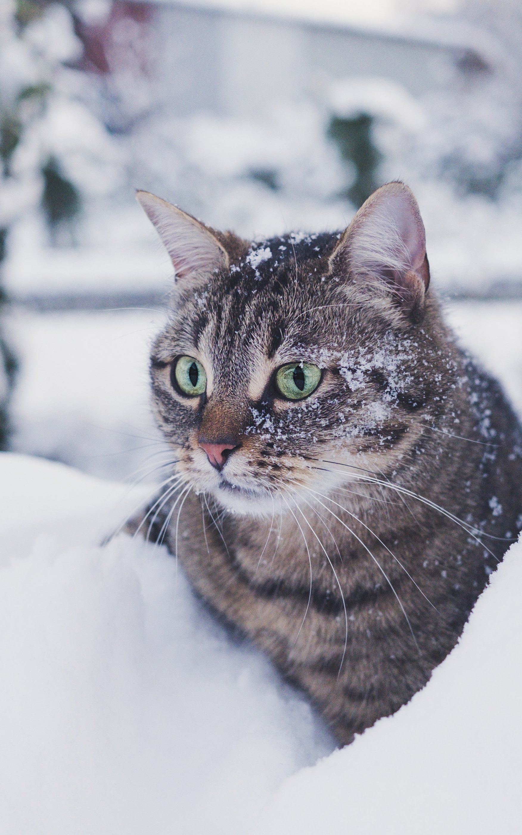 Wallpaper: tabby cat, snow, green eyes - 1752x2800