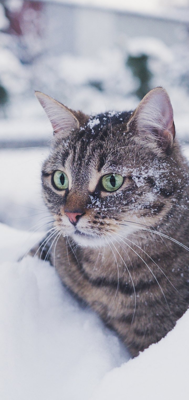 Wallpaper: tabby cat, snow, green eyes - 720x1520