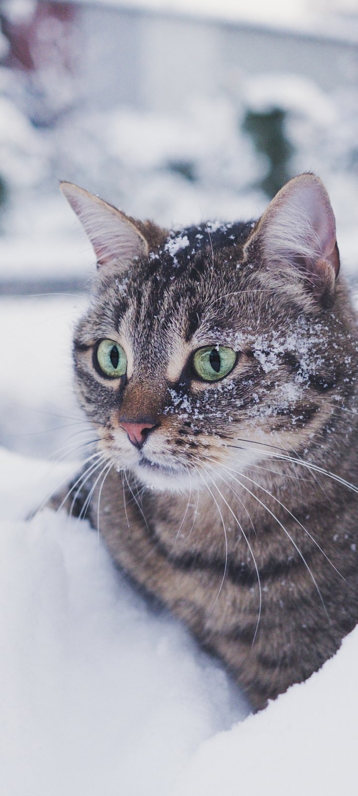 Wallpaper: tabby cat, snow, green eyes - 720x1600