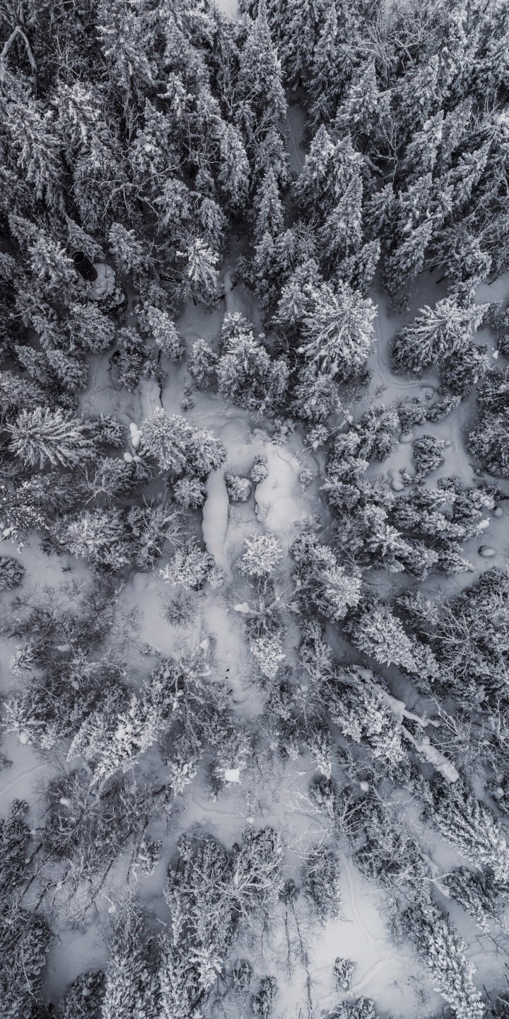 Wallpaper: snowfall, drone photo, winter, trees - 720x1440