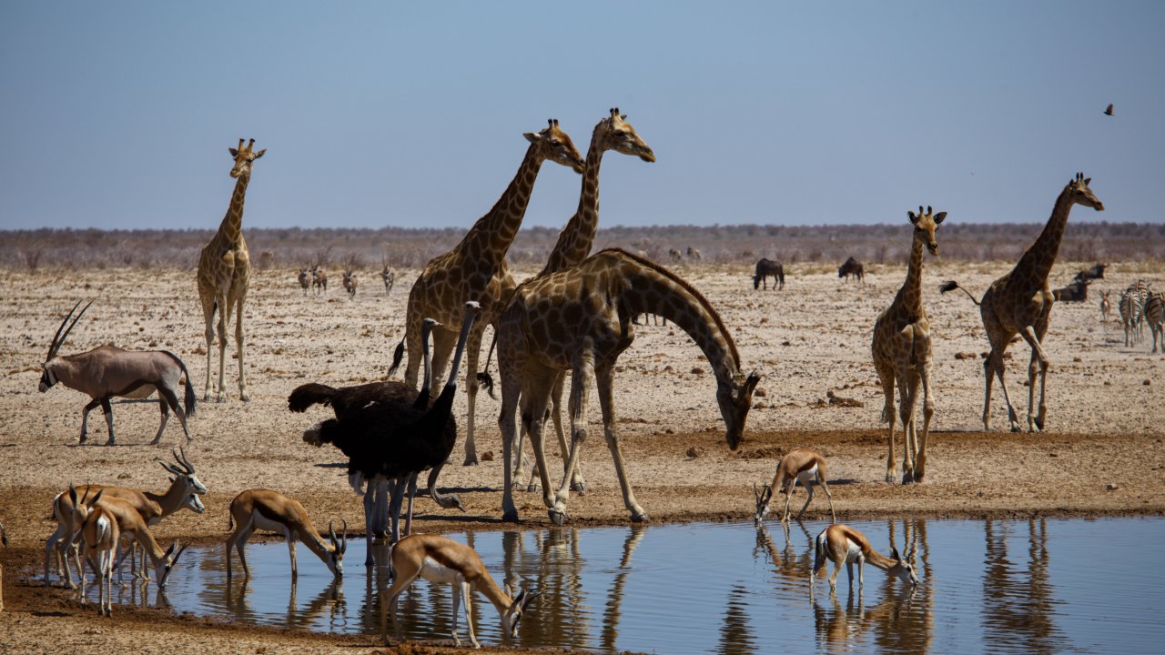 Wallpaper: Etosha, Namibia, wild nature, giraffes - 1280x720