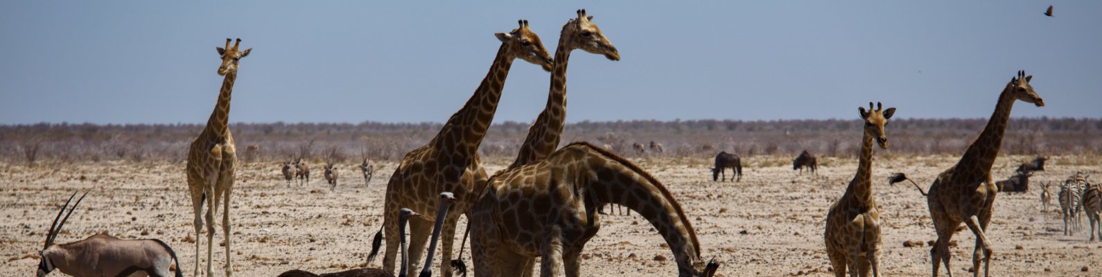 Wallpaper: Etosha, Namibia, wild nature, giraffes - 1590x400
