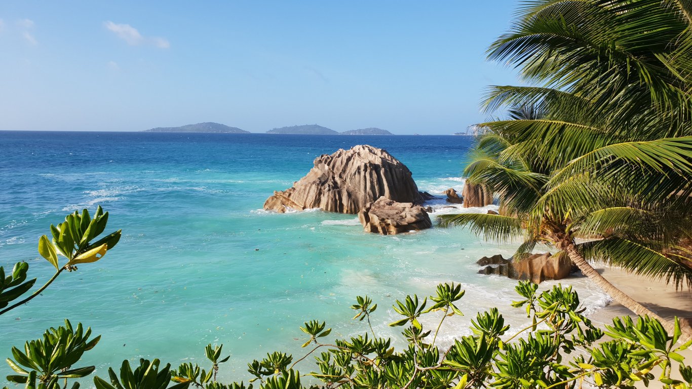 Wallpaper: La-Dig, Seychelles, sea, sun, palm trees - 1366x768