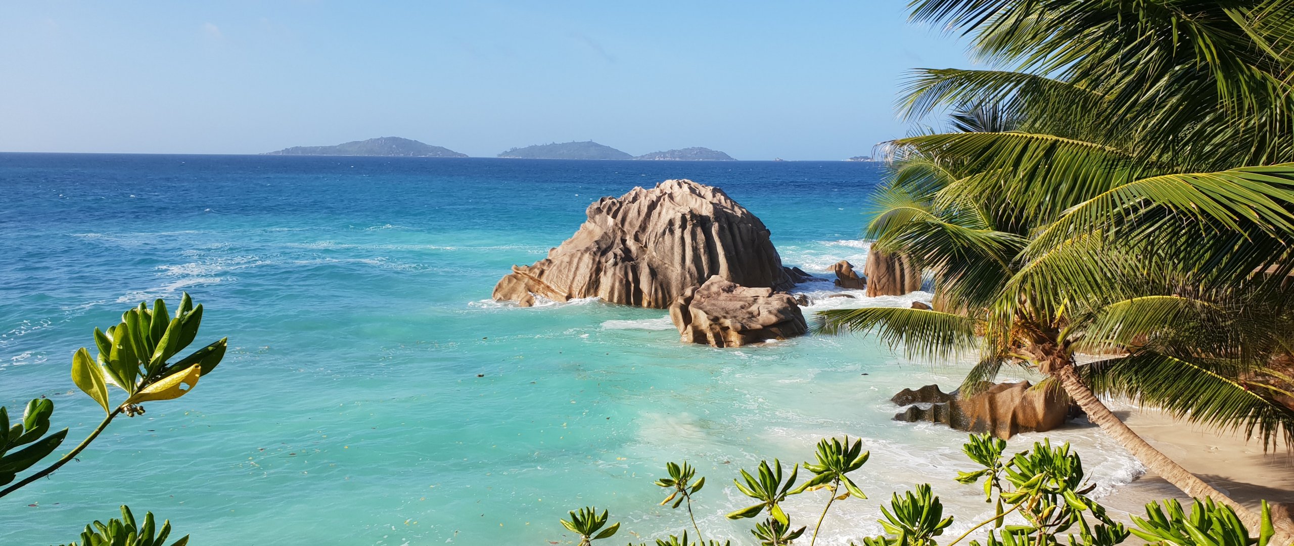 Wallpaper: La-Dig, Seychelles, sea, sun, palm trees - 2560x1080