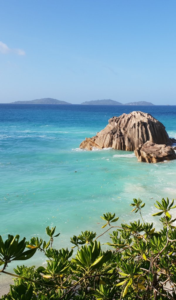Wallpaper: La-Dig, Seychelles, sea, sun, palm trees - 600x1024