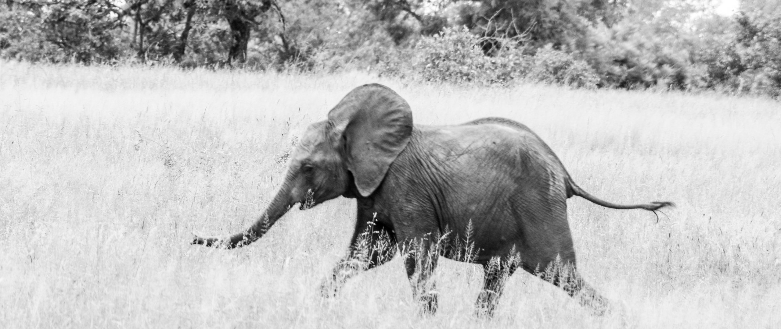 Wallpaper: elephant, African animal, black and white photo - 2560x1080