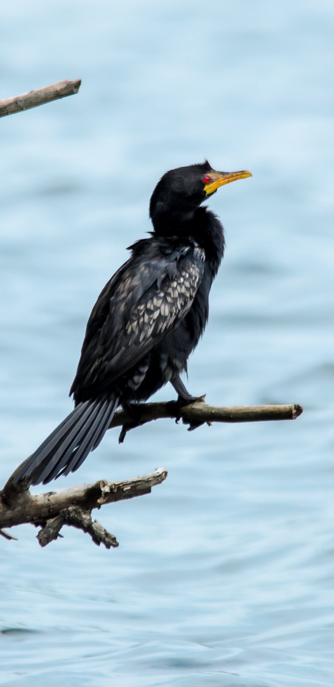 Wallpaper: lake, black bird, red eyes - 1080x2220